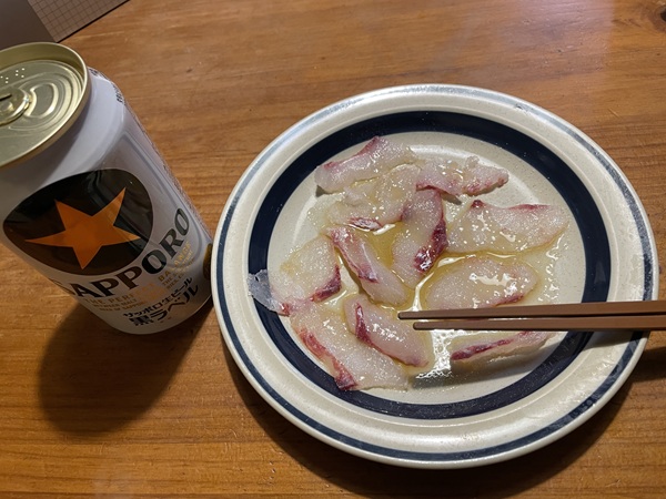 釣れた黒鯛はとりあえず四分の一サイズを生ハム風に仕立ててビールで乾杯。
