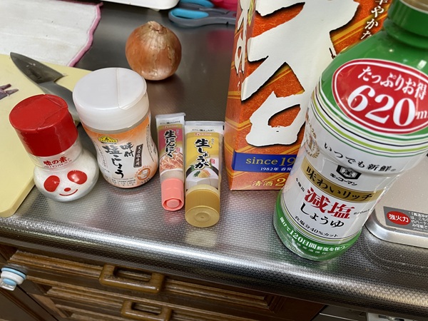 酒・しょうが・ニンニク・塩コショウ・醤油・赤パンダをそれぞれ少々入れて揉み込み味を馴らすために冷蔵庫で休憩。大体どんな魚でもこれで味は決まる。