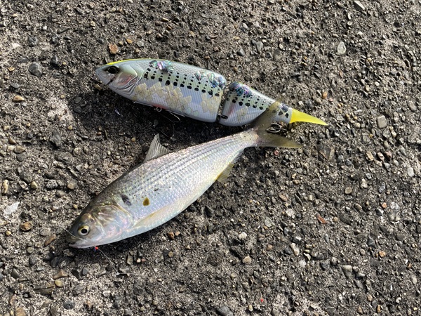 たまに引っかかってくるコノシロはビックベイトと完全一致レベルのサイズ感。