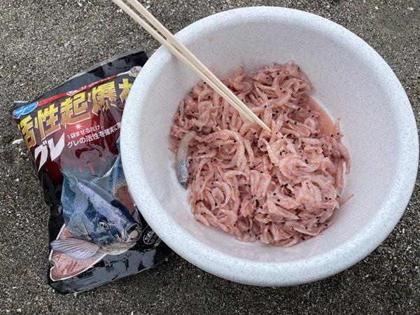 配合餌は無くても良いようだが付けエサが柔らかかったのでオキアミを締める意味でもちょろっと使用。