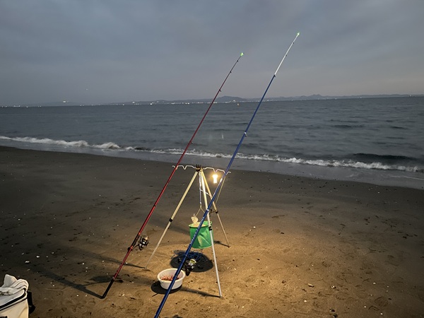 一発カゴに撒き餌と指餌を付けた針を仕込み、遠投した先でぶちまけてそのまま放置。