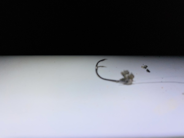 試しに、投入から2分程度で回収してみたところ付けエサがしっかりと着いたまま帰ってきたのでエサ取りに取られるまでにはそこそこの時間が掛かる模様。