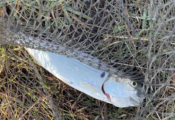 そんなこんなで何とか場所を確保していたら足元に流れてきたベイトらしき魚を一掬い。